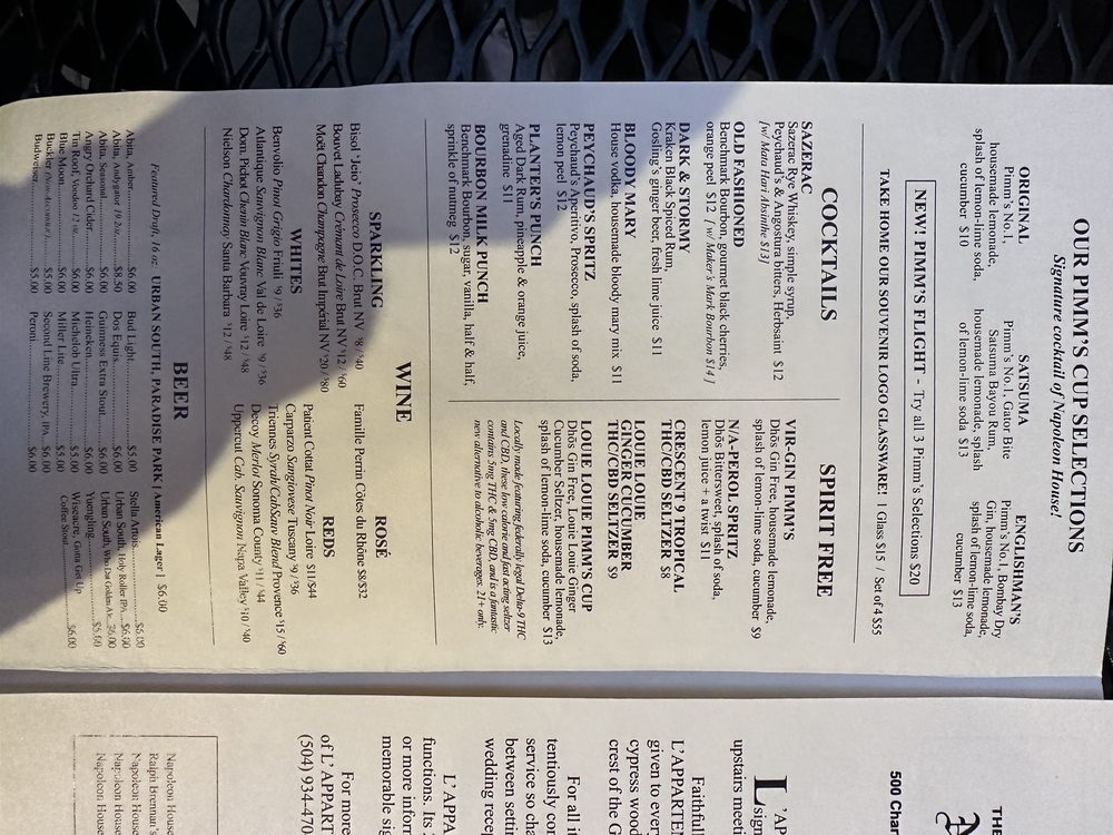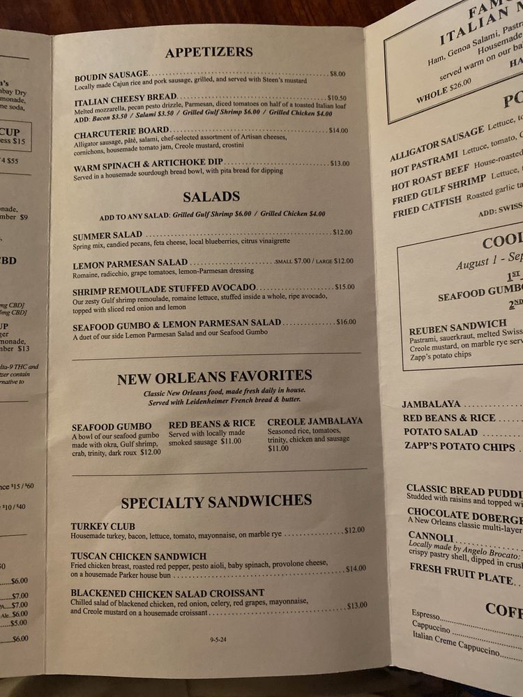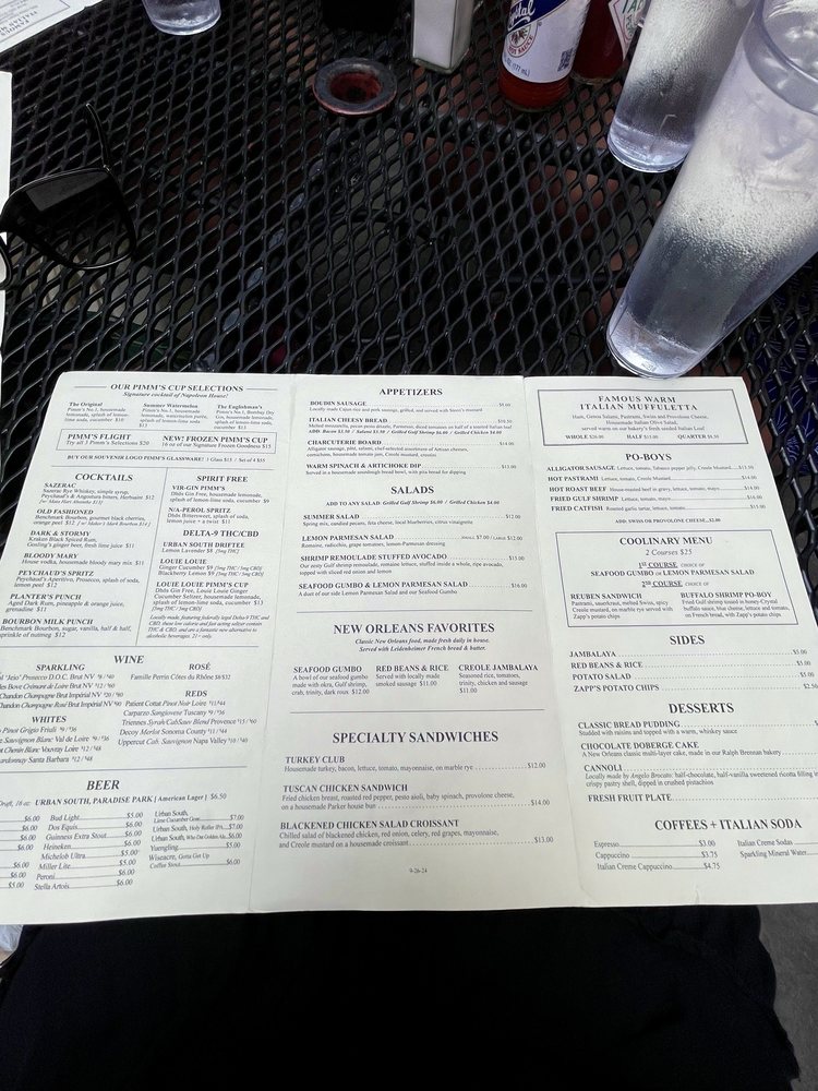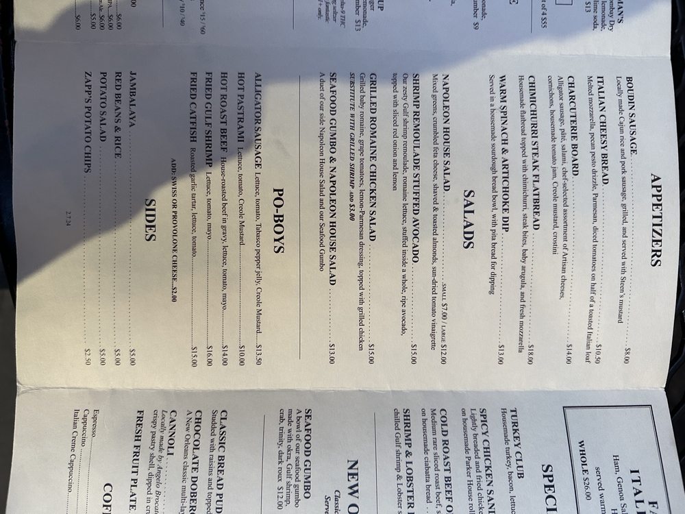 Introducing the menu at Napoleon House, a charming cocktail bar in New Orleans, where classic New Orleans flavors are thoughtfully curated. Start off your meal with standout appetizers like Boudin Sausage, Italian Cheesy Bread, Charcuterie Board, and Warm Spinach & Artichoke Dip. Indulge in signature salads like Muffuletta Salad, Lemon-Parmesan Salad, Shrimp Remoulade Stuffed Avocado, and Seafood Gumbo & Napoleon House Salad. Don't miss out on their Specialty Italian Muffuletta, a warm sandwich filled with a delicious combination of meats, cheeses, and housemade Italian Olive Salad. The ambiance at Napoleon House is cozy, with vintage decor and a charming courtyard patio under the stars. From the friendly service to the bold flavors, Napoleon House captures the essence of New Orleans in every bite.