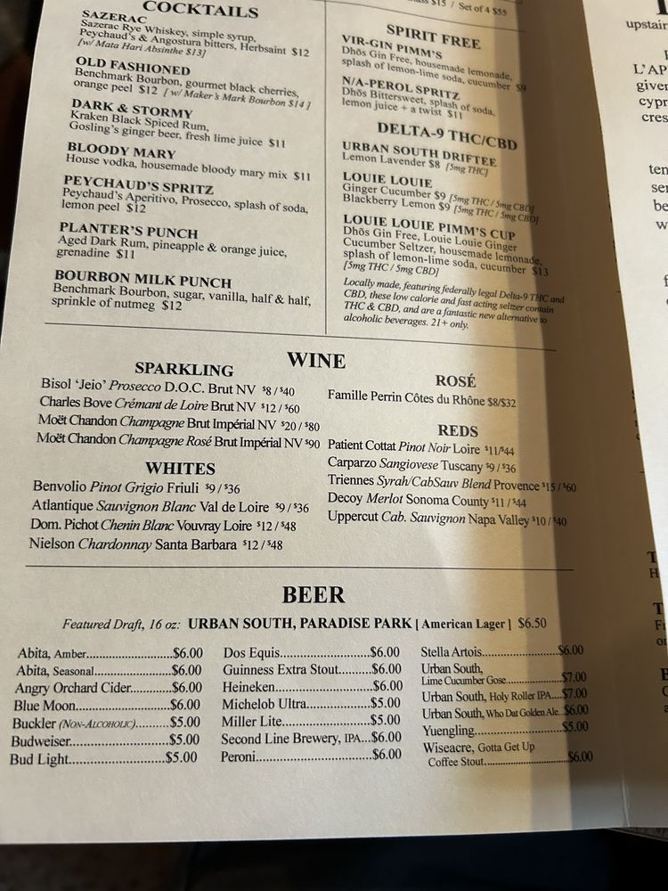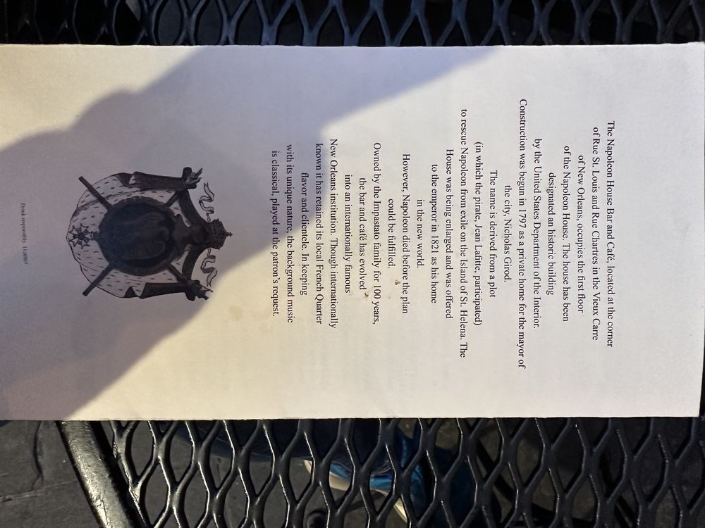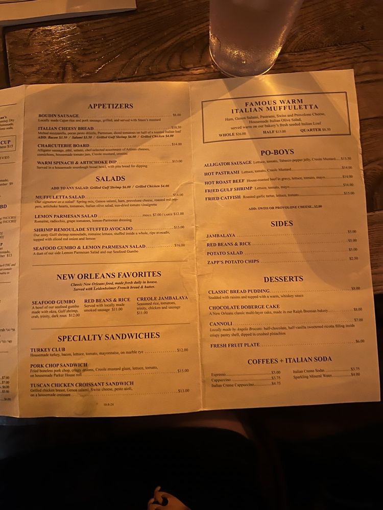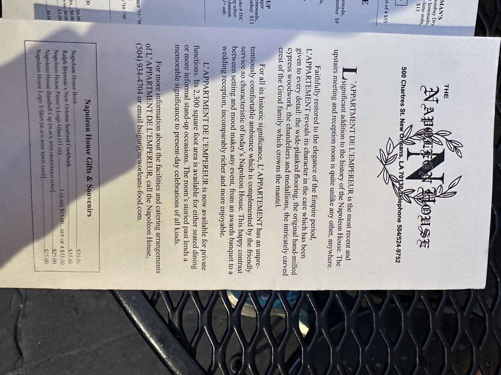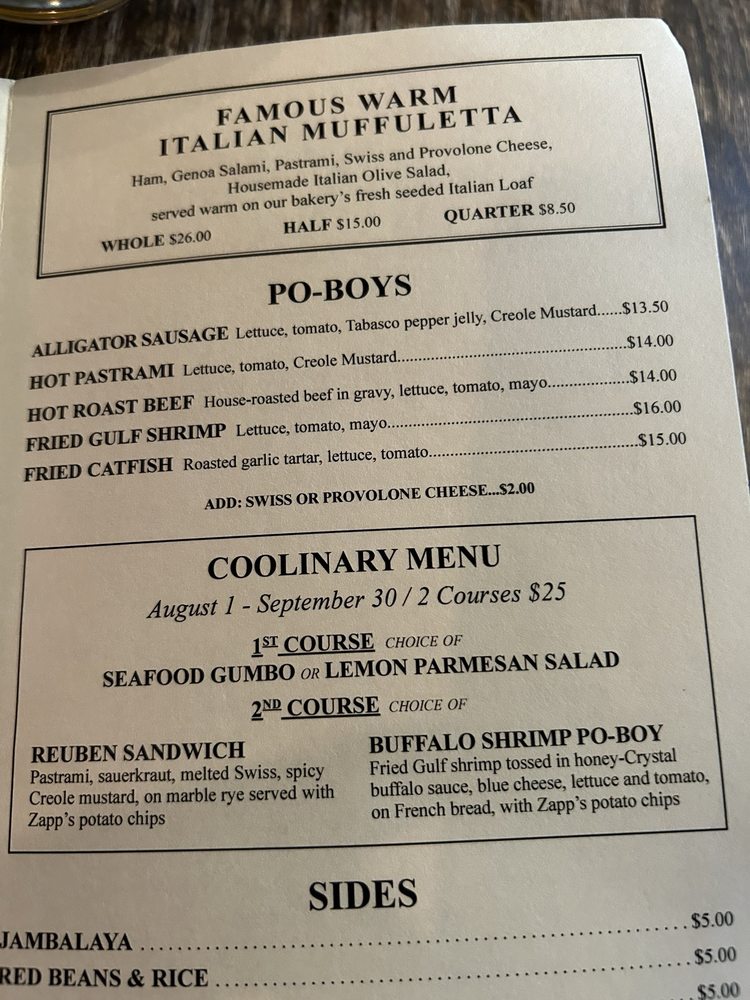 Introducing the menu at Napoleon House, a charming cocktail bar in New Orleans, where classic New Orleans flavors are thoughtfully curated. Start off your meal with standout appetizers like Boudin Sausage, Italian Cheesy Bread, Charcuterie Board, and Warm Spinach & Artichoke Dip. Indulge in signature salads like Muffuletta Salad, Lemon-Parmesan Salad, Shrimp Remoulade Stuffed Avocado, and Seafood Gumbo & Napoleon House Salad. Don't miss out on their Specialty Italian Muffuletta, a warm sandwich filled with a delicious combination of meats, cheeses, and housemade Italian Olive Salad. The ambiance at Napoleon House is cozy, with vintage decor and a charming courtyard patio under the stars. From the friendly service to the bold flavors, Napoleon House captures the essence of New Orleans in every bite.